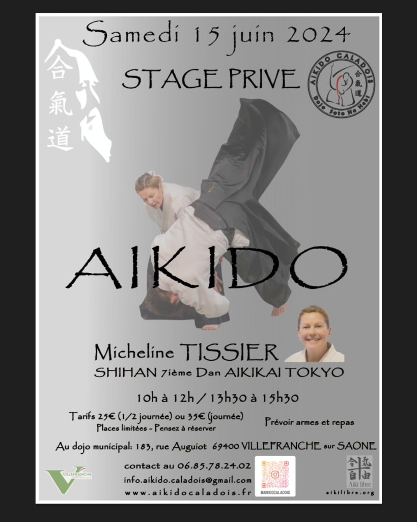 stage Aikido avec Micheline Tissier shihan le samedi 15 juin 2024 Adresse : dojo de Villefranche sur Saône 183 rue Auguoit 69400 Villefranche-sur-Saône horaires 10h-12h00 et 13h30-15h30 Partager : Partager sur X(ouvre dans une nouvelle fenêtre) X Partager sur Facebook(ouvre dans une nouvelle fenêtre) Facebook J’aime chargement…